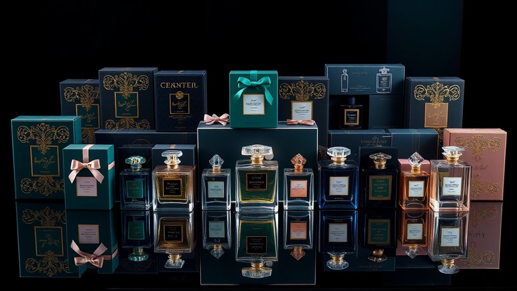 Choosing a luxury perfume gift set means paying close attention to the quality of its ingredients, as this directly impacts both the scent experience and safety. I look for sets crafted with ethically sourced, cruelty-free, and often vegan ingredients, guaranteeing responsible production. Premium fragrances are made with imported European oils that meet strict purity and safety standards, reducing the risk of skin irritation or allergies. Transparency about ingredients and adherence to IFRA guidelines are crucial, confirming that components are safe and environmentally conscious. I also avoid harsh chemicals like parabens and phthalates to assure a clean, skin-friendly scent. Natural extracts and essential oils are key—they enhance longevity, complexity, and sensory richness, reflecting true craftsmanship and elevating the overall fragrance experience.