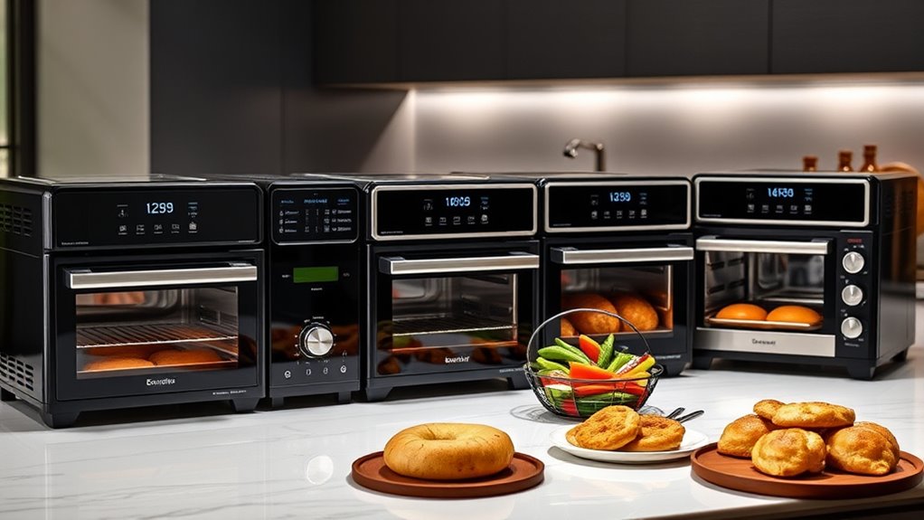 The size and capacity of a luxury toaster oven with an air fryer greatly influence how well it fits into your kitchen and meets your cooking needs. Larger models can handle a 12-inch pizza or a 4-pound chicken, making them perfect for family meals. If you have limited space, compact units with a footprint of around 15-17 inches are ideal for small kitchens. When choosing, think about what you cook most often—whether it’s slices of bread, baked goods, or larger dishes—and pick a size that accommodates those items. Some high-end models feature multi-rack systems that let you cook multiple dishes at once without increasing the overall footprint. Always check interior dimensions and rack configurations to guarantee it suits your specific cooking requirements.