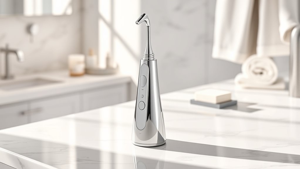 A water flosser feels truly luxurious when it has sleek, high-quality materials like polished chrome or matte finishes that exude elegance. I look for ergonomic designs that fit comfortably in my hand, with intuitive controls for easy use. Features like a compact tank, subtle LED lighting, and thoughtful detailing make it not only functional but also a stylish addition to my bathroom. These details elevate the overall experience and look of the device.