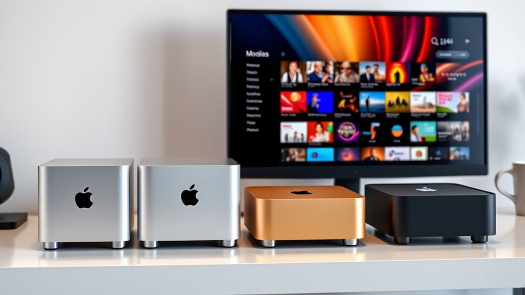 If you’re looking for the best Mac mini models as a media server in 2025, I recommend considering the latest M4 and M4 Pro options. These compact machines offer powerful processors, ample RAM, and fast SSD storage, making them ideal for streaming, editing, and managing media libraries. Their connectivity options and energy efficiency support seamless integration into your setup. Keep exploring further to discover which model fits your needs perfectly and how to maximize its potential.