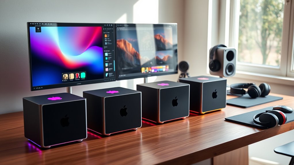 If you’re looking for the best Mac mini setups for creators in 2025, I recommend considering the Apple M4 or M4 Pro models with at least 16GB of RAM, depending on your workload. For intensive tasks, the M4 Pro with a 12-core CPU and 16-core GPU offers top performance, while standard M4 versions suit lighter work. Storage should be at least 512GB SSD for large files. To guarantee your setup is future-proof, I’ll guide you through each option and what’s best for your needs.
