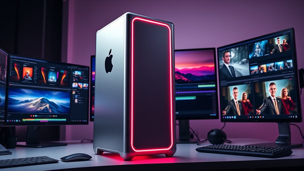 Choosing the right Mac Pro for professional video editing hinges on matching its processing power to the demands of your projects. First, assess the complexity and resolution of your work—high-core count CPUs like 14 or 16 cores are essential for intensive tasks. Consider whether hardware-accelerated media engines or ray tracing are necessary for real-time effects or 3D workflows. Large, unified memory (36GB or more) can prevent bottlenecks during multitasking and handling large media files. If you’re working on multi-stream editing or rendering 8K footage, a more powerful CPU with higher core counts and faster speeds becomes vital. Ultimately, aim for a CPU that delivers near-desktop levels of performance, ensuring smooth, efficient post-production workflows without compromise.