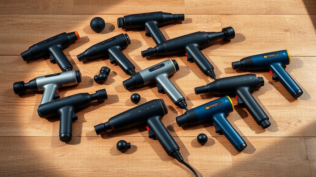 If you’re looking for the best massage guns in 2025 to help with muscle recovery, there are plenty of options with deep tissue penetration, adjustable speeds, and targeted attachments. Many models feature heat and cold therapy, long battery life, and quiet operation, making them perfect for soothing soreness and boosting performance. Whether you want compact portability or more powerful deep tissue relief, I’ll guide you through the top choices to suit your needs. Keep going to discover more.