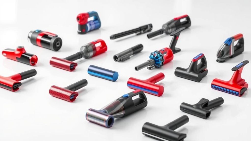 Choosing the right attachments and accessories can considerably boost your mini vacuum’s effectiveness across various cleaning tasks. Nozzles like crevice tools help reach tight spaces, while pet hair brushes make removing fur easier. Inflators and blowers expand your vacuum’s use beyond simple dust removal, useful for inflating or clearing debris. Washable filters and reusable dustbins in accessories not only simplify maintenance but also cut ongoing costs. Some models feature LED lights or adjustable nozzles, improving visibility in dark or hard-to-reach areas. Multiple attachments allow you to clean upholstery, keyboards, car interiors, and small crevices efficiently. The right accessories enhance your vacuum’s versatility, turning it into a multi-functional cleaning tool that adapts to various surfaces and tasks, making your cleaning routine smoother and more effective.
