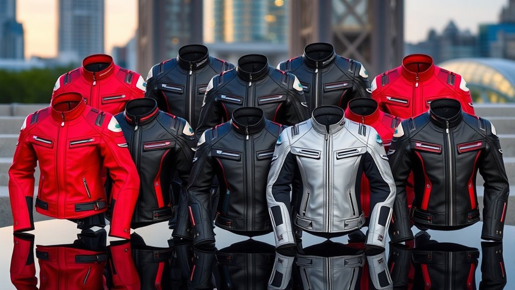 If you’re looking for the 12 best motorcycle jackets for safety and style in 2025, I recommend options that combine durable materials like leather and technical textiles with CE-rated armor. Features like reflective accents, weather resistance, and adjustable ventilation are essential for comfort and visibility. Whether it’s sleek leather designs or mesh jackets for ventilation, these choices prioritize protection without sacrificing style. Keep going to discover detailed insights and expert tips for selecting the perfect jacket for your ride.