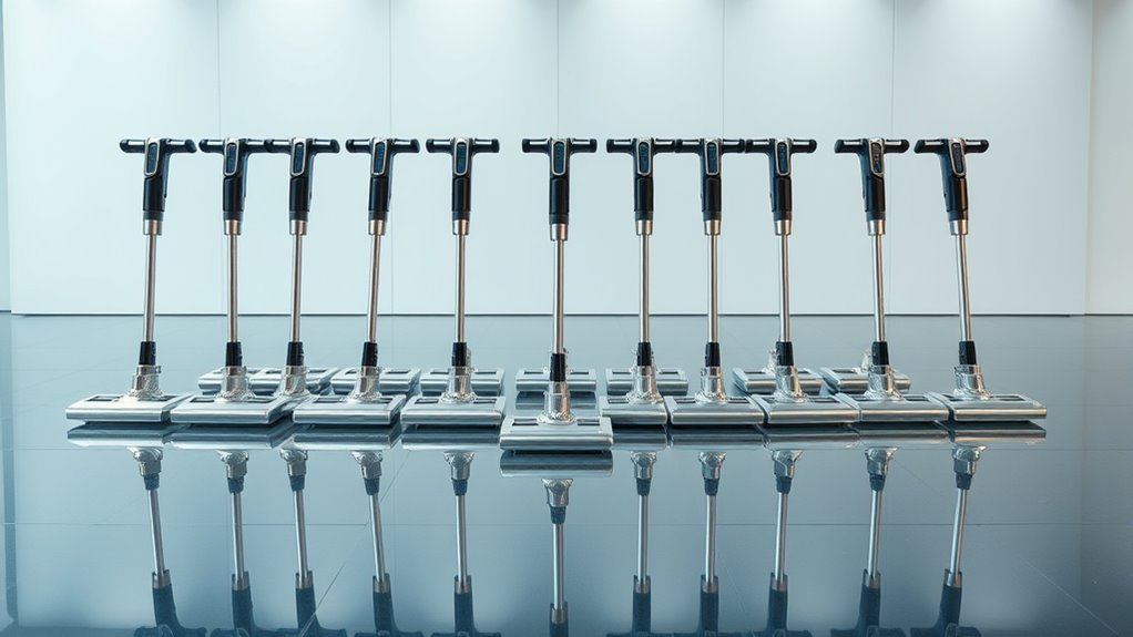 When choosing a nano-coating floor applicator, it’s important to weigh the initial purchase price against how many coatings it can effectively apply. A more expensive model might seem costly upfront but can offer better value if it covers more surface area and lasts longer. Reusable applicators tend to be more economical over time, especially with proper maintenance, compared to disposables. The quality of materials, like microfiber or foam, influences durability and replacement frequency, affecting costs. Don’t forget to contemplate additional expenses such as refills or replacement pads, which add up over the applicator’s lifespan. Ultimately, selecting a cost-effective option means balancing affordability with features that ensure even, professional-quality coatings, saving money and effort in the long run.