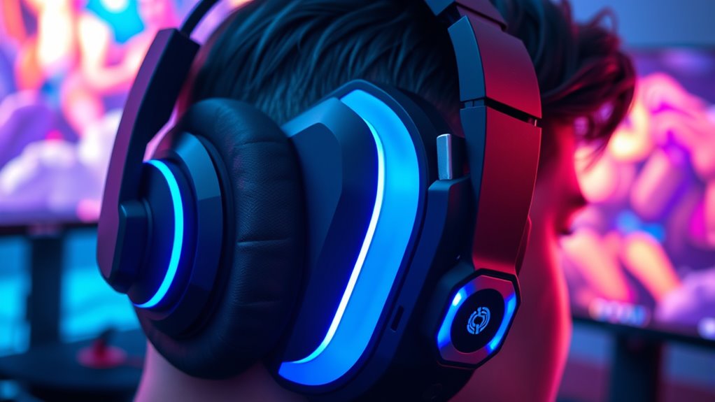 Long gaming sessions can quickly become uncomfortable if your headset isn’t designed with comfort in mind. Look for models with memory foam or protein leather ear cushions, which provide softness and reduce pressure during hours of play. An adjustable headband ensures a snug, personalized fit, preventing soreness from tight or loose fit issues. Lightweight headsets, ideally under 1.5 pounds, help minimize fatigue and strain over extended periods. Breathable ear padding materials are essential to prevent heat buildup and sweating, keeping you comfortable even during intense gaming marathons. Ergonomic shapes and padded ear cups help distribute pressure evenly across your head and ears, reducing discomfort. Prioritizing these comfort features guarantees you can focus on your game without distractions from discomfort or fatigue.