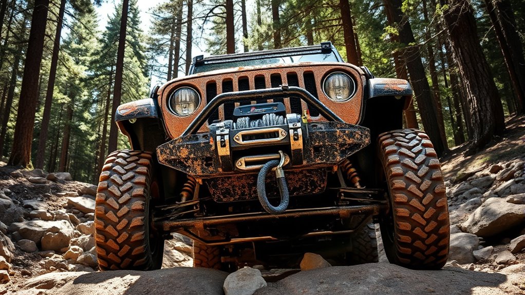 When selecting off-road winches that can handle tough terrain, I look for models with high capacities like 12,000 to 18,800 lbs, durable construction, and waterproof ratings such as IP68. Features like synthetic ropes, wireless remotes, and corrosion resistance are essential for reliability and safety. I’d explore options like the Warn Zeon or Chic Muse models. Stay tuned, as I’ll guide you through the top picks and what makes them stand out.