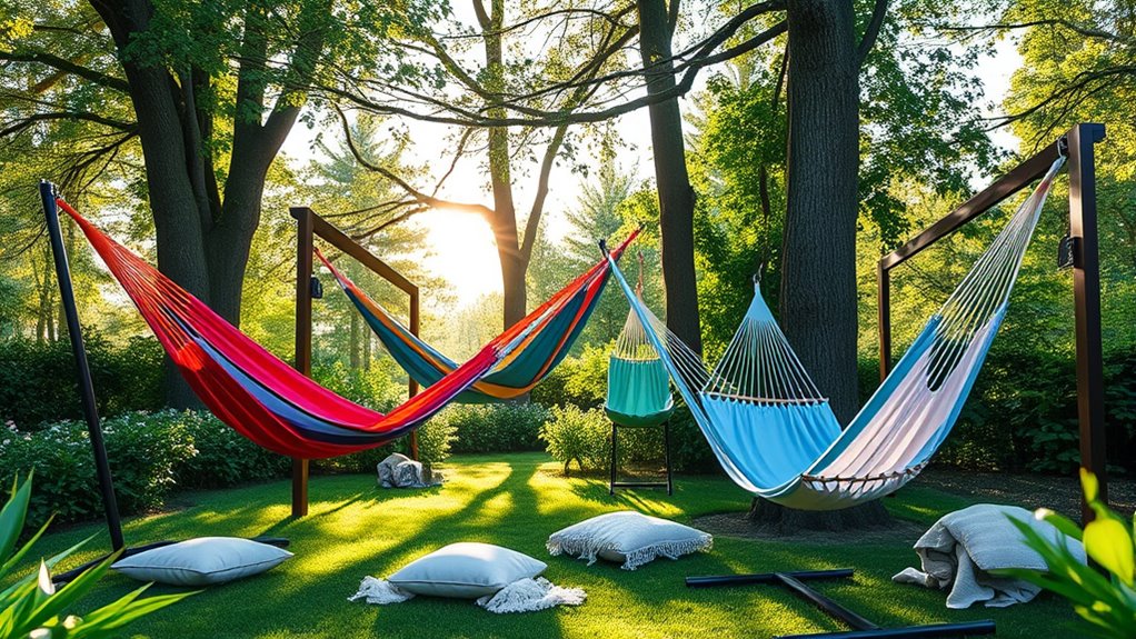 Choosing the right style and design for an outdoor hammock with a stand is essential to match your personal taste and outdoor decor. There are many options, from traditional woven and quilted styles to Brazilian-inspired designs, each offering a distinct look. The design also features spreader bars, which affect both appearance and stability—curved or straight bars create different visual effects. Color schemes and patterns, like bold hues or subtle neutrals, can complement your outdoor space and make your hammock stand out. Decorative touches such as tassels, side pockets, or contrasting stripes add personality and flair. Additionally, the choice of materials—cotton, polyester, or blends—impacts the texture and durability, helping you find a style that’s both attractive and suited for outdoor use.