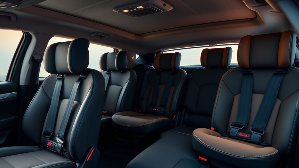 Choosing a premium all-in-one car seat that adapts to your child’s growth means focusing on adjustable features that make safety and comfort effortless. I look for seats with no-rethread harness systems, so I can easily modify height and headrest with one hand as my child grows. Multiple headrest positions, often between 9 and 15, ensure a secure fit at all stages. I also prefer models with multi-position recline options and adjustable legroom, which help maintain proper positioning and comfort. Growth-adjustable harnesses that extend without rethreading are a must, keeping safety consistent over time. Additionally, built-in growth indicators or visual guides help me quickly verify correct harness and headrest positioning, giving peace of mind as my child transitions through different ages.