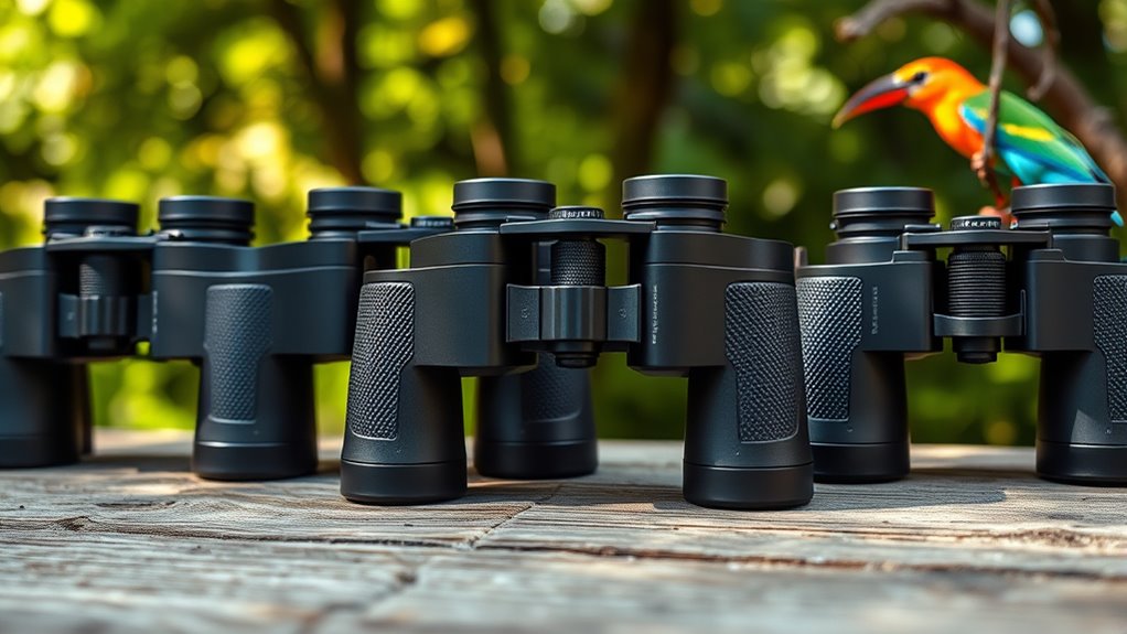 Choosing the right binoculars for bird watching often depends on their size and weight, since these factors directly affect how easy they are to carry and handle during outdoor outings. I prefer lightweight models under 2 pounds because they’re easier to carry for long periods. Small-sized binoculars, like 12×32 or 12×25, fit comfortably in pockets or small bags, making them highly portable. Larger binoculars with 50mm or bigger lenses offer brighter images but tend to be bulkier and heavier, which can cause fatigue. For extended viewing sessions, tripod-adaptable models help stabilize the view, reducing arm strain. Ergonomic designs with textured grips and adjustable straps also improve handling and transport. Overall, balancing size, weight, and comfort guarantees I can enjoy bird watching without unnecessary hassle.
