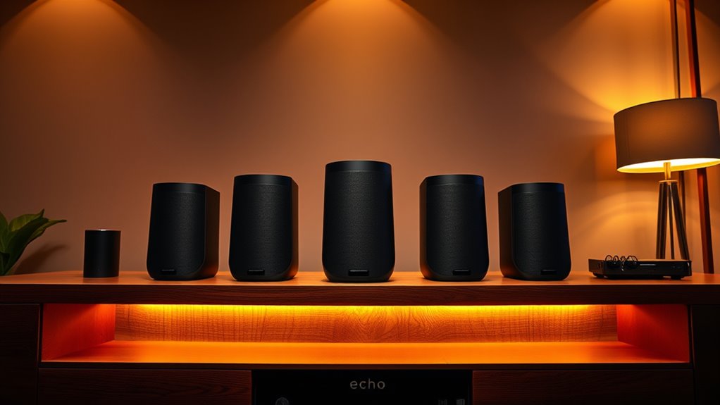 If you’re looking for the best premium speaker systems for your Echo Studio in 2025, I recommend options like high-end stands made from North American black walnut for a sleek look and better sound, along with portable Bluetooth speakers like Harman Kardon Onyx Studio 9 for outdoor use. Sophisticated bookshelf systems from Edifier and Sonos offer rich, room-filling sound. To get all the details and discover the top choices, keep exploring; there’s more to uncover.