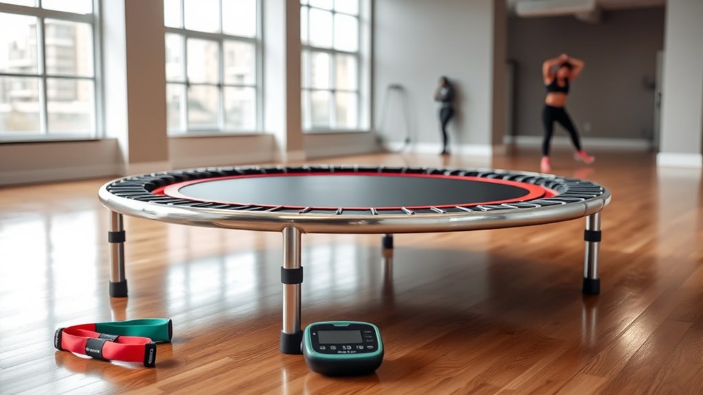 Choosing a premium fitness trampoline set without considering safety features can lead to unnecessary risks during your workouts. Safety elements like padded edges, non-slip legs, and adjustable handlebars are vital for preventing injuries. Impact-absorbing bungee cords or reinforced springs help reduce joint stress, making your bounce safer and more comfortable. Stability is also essential—wide bases and anti-slip feet keep the trampoline steady during intense sessions. Additionally, safety certifications ensure the product meets strict safety standards and quality benchmarks. Extra accessories like protective covers, support bars, and noise reduction systems further enhance security and peace of mind. Prioritizing these safety features protects you from potential accidents, allowing you to focus on achieving your fitness goals confidently.