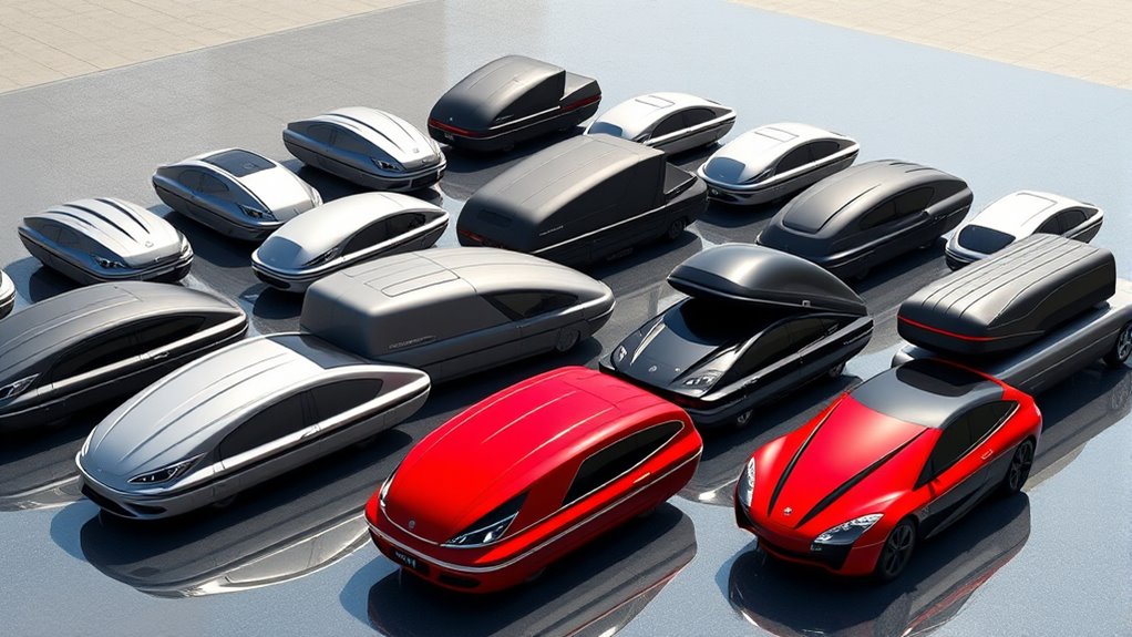 When choosing a premium roof cargo box, considering its aerodynamic design is essential because it directly impacts your vehicle’s performance and efficiency. An aerodynamic shape reduces wind resistance, which can improve fuel economy during your trips. It also minimizes wind noise, making highway driving more comfortable. A sleek, streamlined profile experiences less lift and bounce at high speeds, increasing stability and safety. Properly designed aerodynamics help decrease drag, which not only boosts efficiency but can also extend your vehicle’s lifespan and cut emissions. Additionally, an aerodynamic cargo box lessens the effects of crosswinds, giving you better control and a smoother ride. Overall, investing in a well-designed roof box enhances your driving experience through improved efficiency, safety, and comfort.