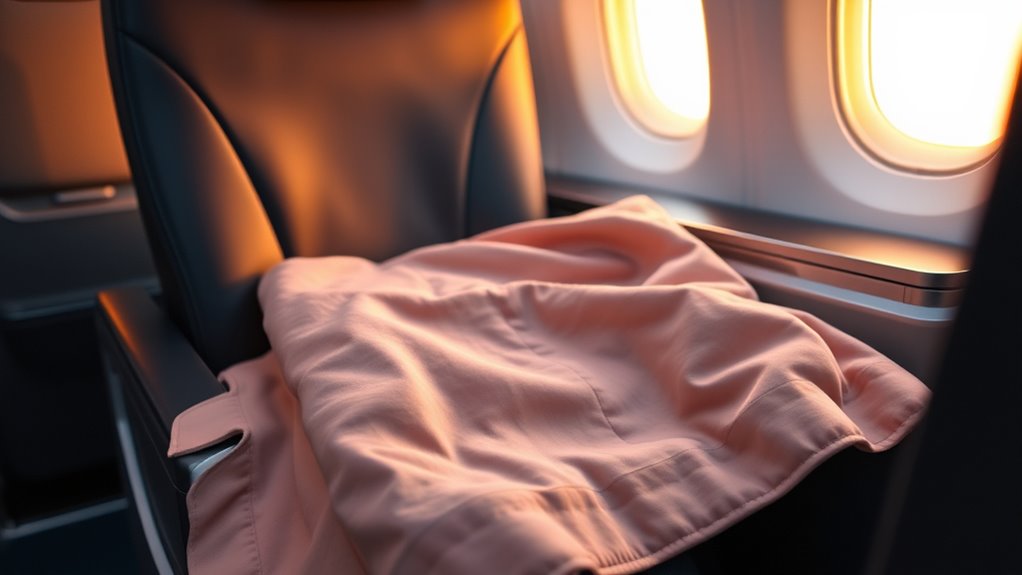 Choosing a premium travel blanket that feels truly soft and comfortable hinges largely on its fabric type and quality. Fabrics like microfiber polyester, micro plush, or bamboo viscose offer velvety textures that feel gentle against the skin. Higher GSM ratings, such as 260 GSM or above, provide a thicker, plush feel that enhances comfort on long flights. Breathable materials like microfiber polyester help prevent overheating while maintaining a soft touch, ensuring you stay cozy without getting too hot. Additionally, fabrics like micro fleece or microfiber tend to soften further after multiple washes, maintaining their plushness over time. For sensitive skin, opting for hypoallergenic and chemical-free fabrics can reduce irritation, making your travel experience even more comfortable.