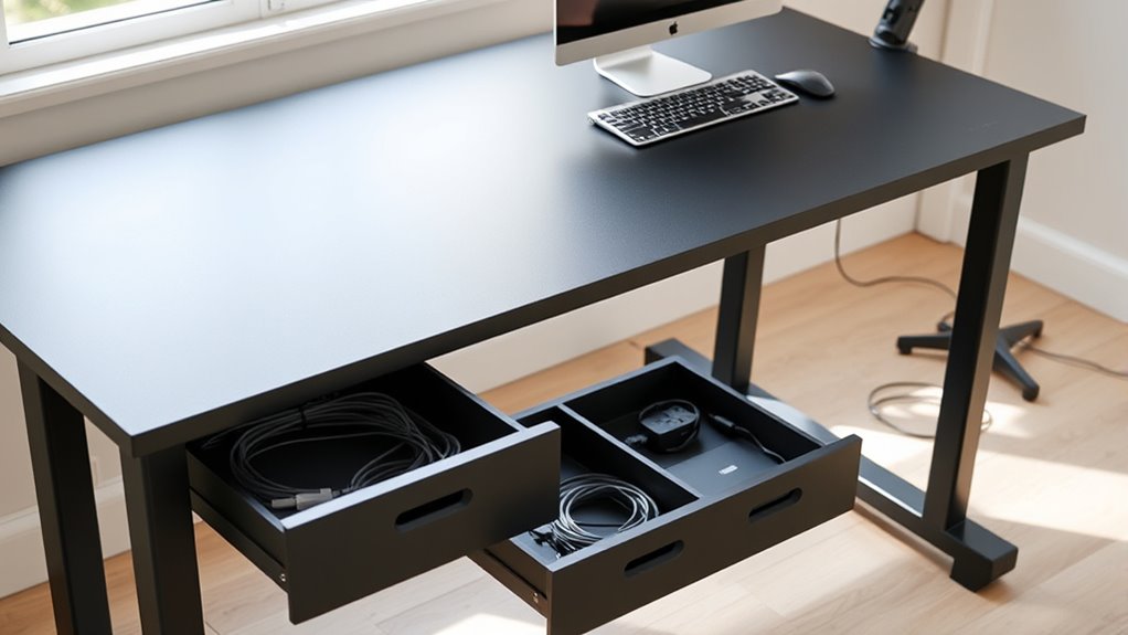 Built-in cable management solutions play an essential role in maintaining an organized and clutter-free workspace. Trays, clips, and channels help keep cords neatly tucked away, preventing tangles and visual clutter. Integrated outlets and power strips provide easy access to electrical connections without trailing wires, making setup more convenient. Cable management drawers with dedicated compartments are perfect for storing chargers, adapters, and accessories, keeping everything easily accessible yet out of sight. Proper routing features are vital—they prevent cords from pulling or tangling during height adjustments, ensuring safety and stability. High-quality sit-stand desks often include adjustable or removable cable management components that enhance both organization and aesthetic appeal. Choosing a desk with these built-in solutions can markedly improve your workspace’s efficiency and appearance.