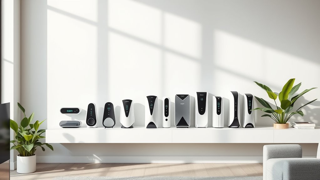 If you’re looking for the best smart air purifiers in 2025, I recommend models like LEVOIT’s Core series, GoveeLife, and BLUEAIR, which offer excellent coverage, advanced HEPA filtration, and smart features like app control and voice compatibility. Larger units handle big rooms, while compact ones are great for bedrooms or offices. If you want consistently cleaner air with easy management, these top picks are worth considering—stay tuned to discover more options to suit your needs.