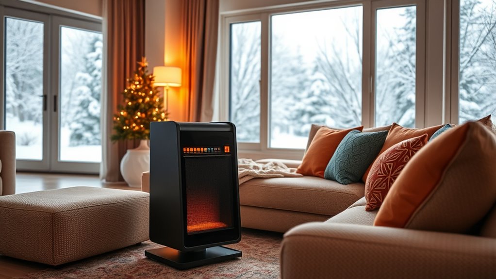 When choosing a space heater for a large room, paying attention to noise levels and portability can make a big difference in daily comfort and convenience. Quiet models operating below 35dB are ideal for bedrooms and offices, ensuring minimal disturbance during sleep or work. Noise levels up to 55dB might be acceptable in less sensitive spaces but can be disruptive elsewhere. Portability is equally important; lightweight heaters under 20 pounds with handles or wheels make repositioning easy, so you can direct heat where needed. Compact tower designs and built-in handles enhance maneuverability, allowing you to move the heater effortlessly between rooms. Balancing noise and portability helps create a warm, comfortable environment without sacrificing convenience or tranquility.