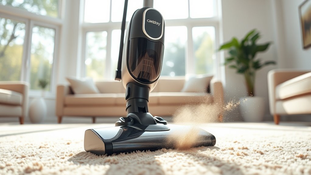 Choosing a vacuum with excellent filtration is essential if you want to guarantee that no dust, allergens, or microscopic particles escape back into the air. HEPA filters are a top choice because they can trap 99.99% of tiny particles, improving indoor air quality. The filtration system’s efficiency depends on how well it prevents dust and allergens from escaping during cleaning. Rinseable or replaceable filters help maintain performance over time, avoiding clogging and suction loss. A sealed system design, where the filter is integrated with the dustbin, minimizes dust leakage and ensures allergens stay contained. High-quality filtration makes a significant difference, especially for allergy or asthma sufferers, by trapping pet dander and microscopic debris that traditional filters might miss.