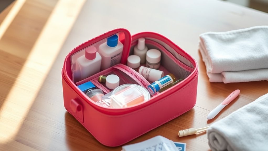 Choosing the right size and capacity for your travel toiletries organizer is essential to make sure it fits comfortably in your bag and holds everything you need. Consider the size of your travel bag and guarantee the organizer isn’t too bulky or oversized. Evaluate how many compartments and pockets you need—whether it’s enough for full-sized bottles or only travel-sized essentials. Some organizers have expandable or flexible sections, which can be helpful if your toiletries vary. Think about how easy it is to pack and retrieve items, especially if you carry larger bottles or travel with others. Larger capacity organizers are perfect for longer trips, while smaller ones work well for quick getaways or minimal packing. Picking the right size keeps your essentials organized without overloading your bag.
