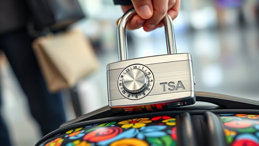Selecting a TSA-approved luggage lock that’s easy to use during security inspections can make a big difference in your travel experience. These locks allow TSA agents to open and inspect your luggage without damaging the lock, thanks to universal TSA keys. Many models include inspection indicators, like a pop-up or red mark, so you know when your bag has been accessed. Re-locking mechanisms keep your luggage secure after inspection, preventing accidental openings during transit. The quick and efficient access provided by TSA keys reduces delays and minimizes damage risks. Additionally, simple combination or key systems let you verify that your luggage has been inspected, giving you peace of mind. Overall, choosing a lock with easy inspection access streamlines security checks and protects your belongings.