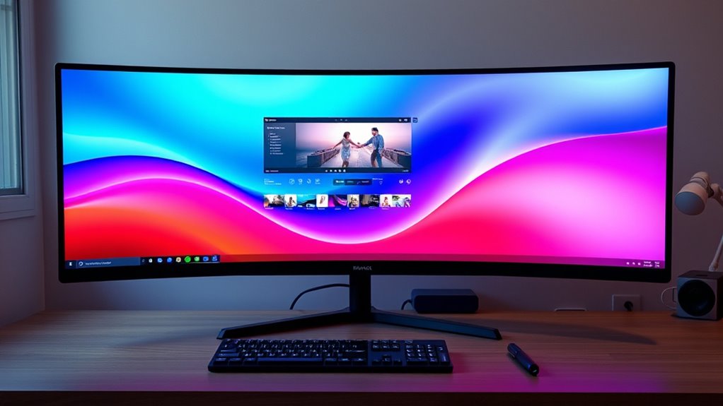 Imagine your screen as a gentle mountain range cradling your workflow—curvature can make that a reality. It reduces eye strain, keeps everything within peripheral vision, and minimizes head movement, boosting multitasking efficiency. The right curve creates an immersive experience, making you feel like you’re working inside your project. So, it’s not just a fancy feature; it’s a secret weapon for productivity, turning your desk into a command center.