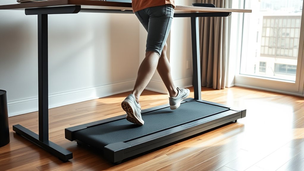 Selecting an under-desk treadmill requires careful attention to its size and portability to guarantee it fits comfortably in your workspace. Most models range from 39 to 48 inches in length, so measuring your space beforehand is essential. Lighter units, weighing around 26 to 37 pounds, are easier to move and reposition when needed. Many treadmills come with built-in transport wheels or handles, making relocation straightforward. If space is limited, consider foldable or compact designs that can be stored upright or slide under furniture when not in use. Additionally, check the maximum supported weight and stability features to ensure safe, secure use in various environments. Prioritizing size and portability helps you find a treadmill that fits seamlessly into your workspace without sacrificing convenience or safety.